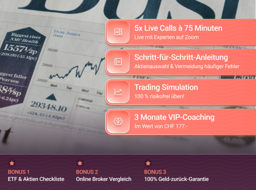 Bonus: Online Broker Vergleich, Checkliste für Anlage mit ETFs, Aktienlisten, exklusive Gruppe von max. 30 Teilnehmer:innen, Geld-zurück-Garantie